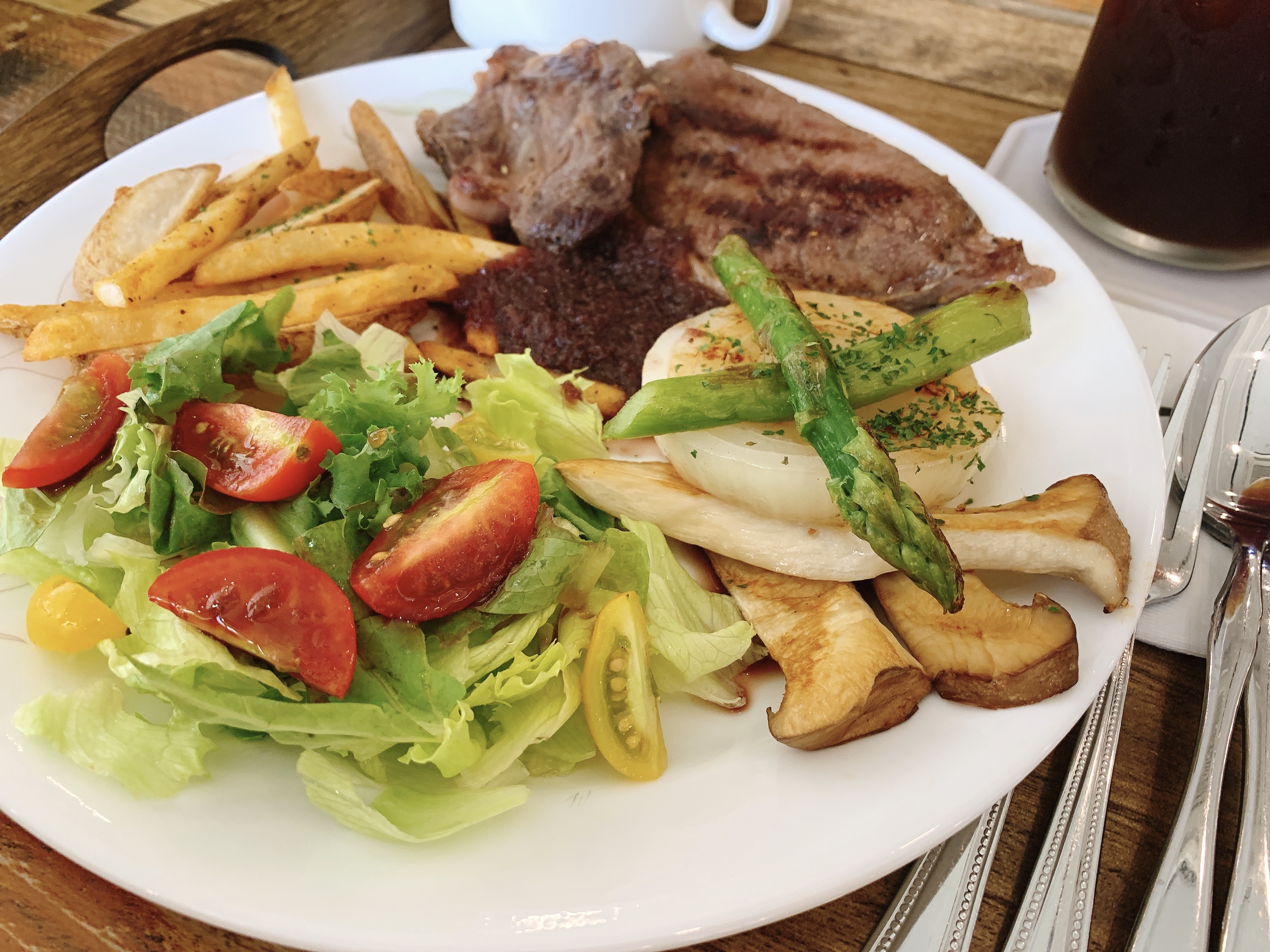 스테이크와 감자튀김, 야채구이, 샐러드로 구성