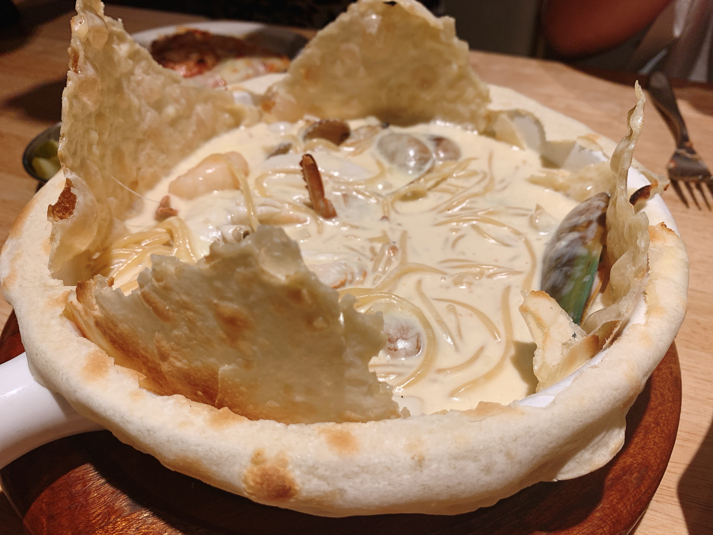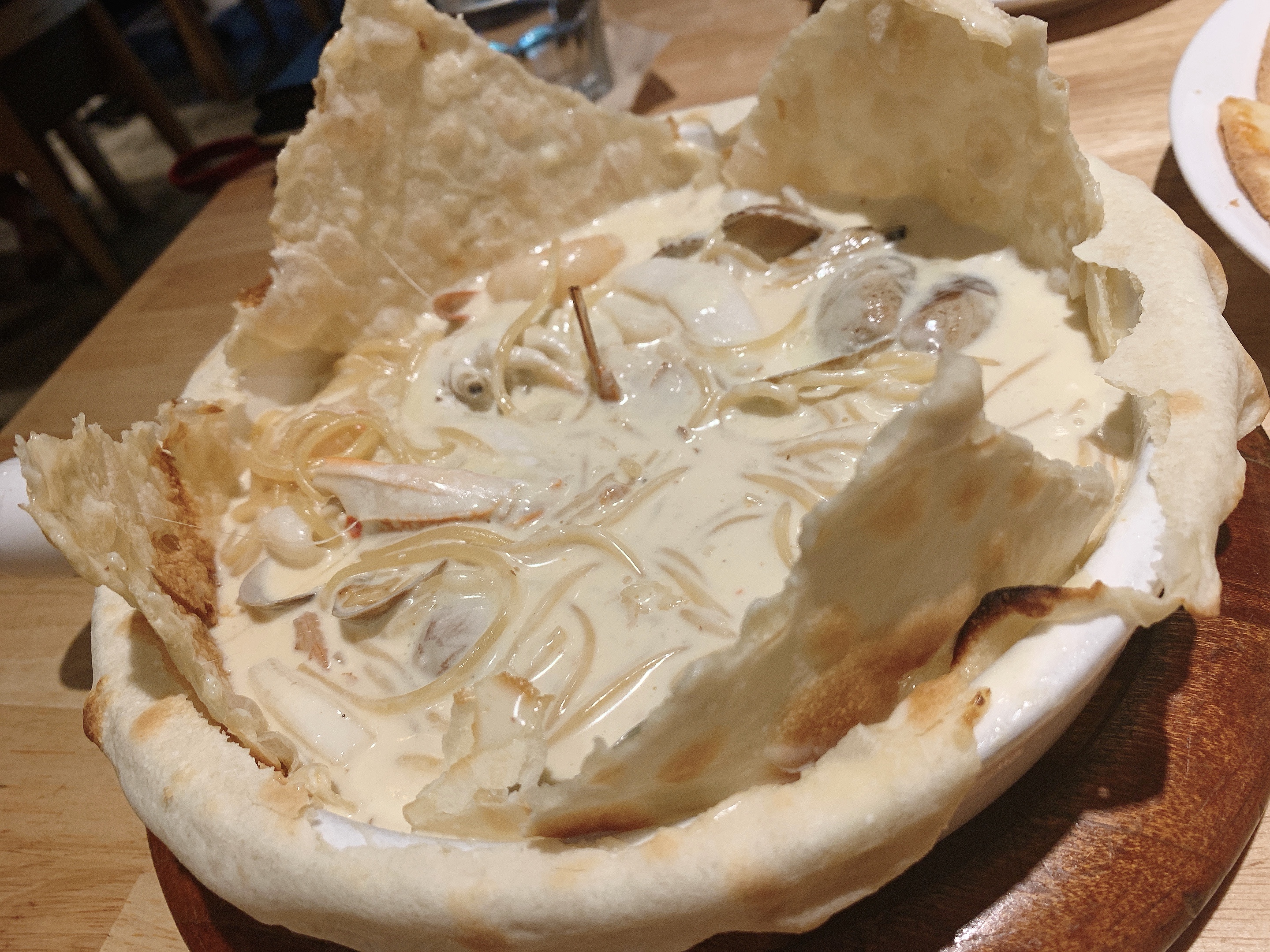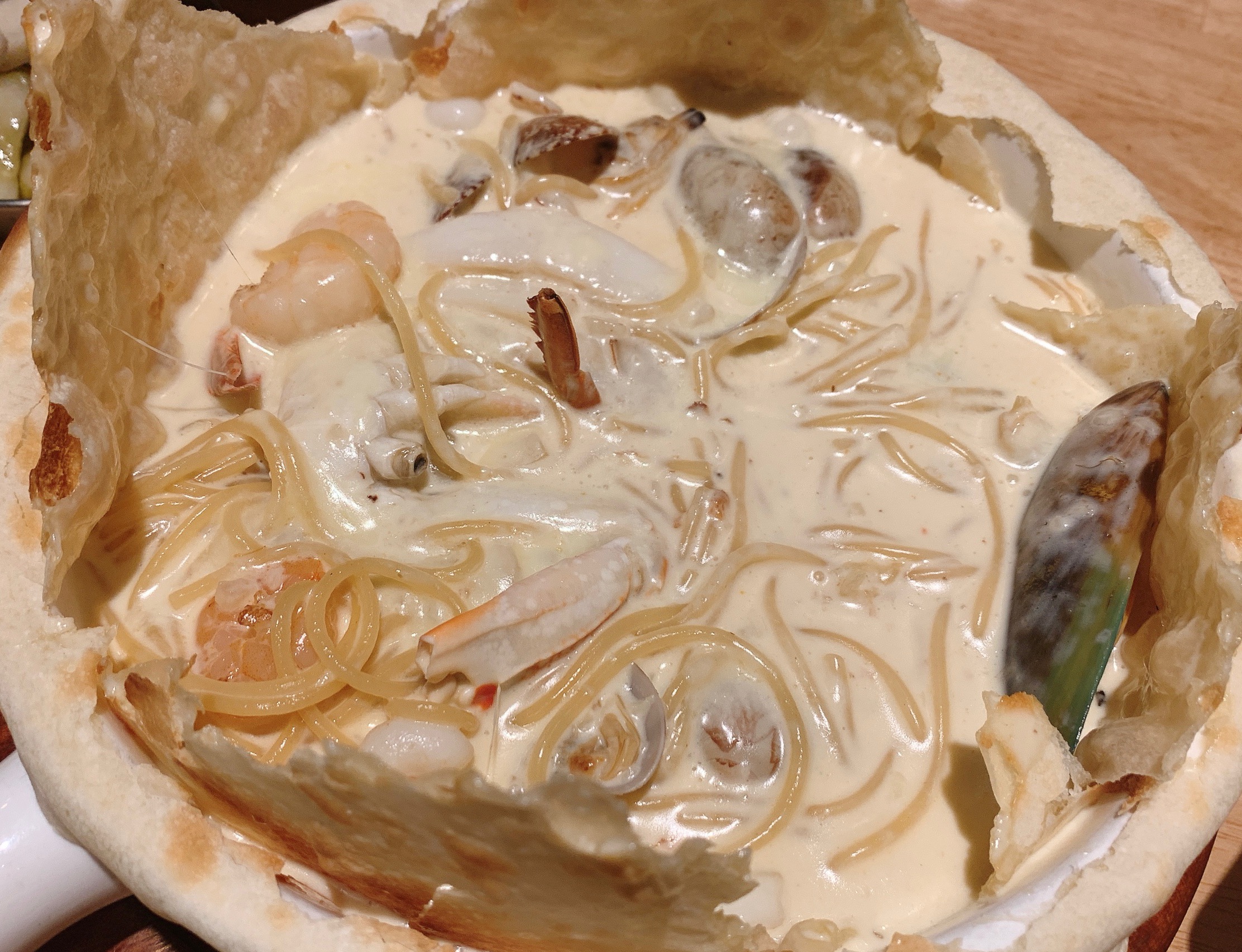 해산물을 넣어 만든 크림 파스타 위에