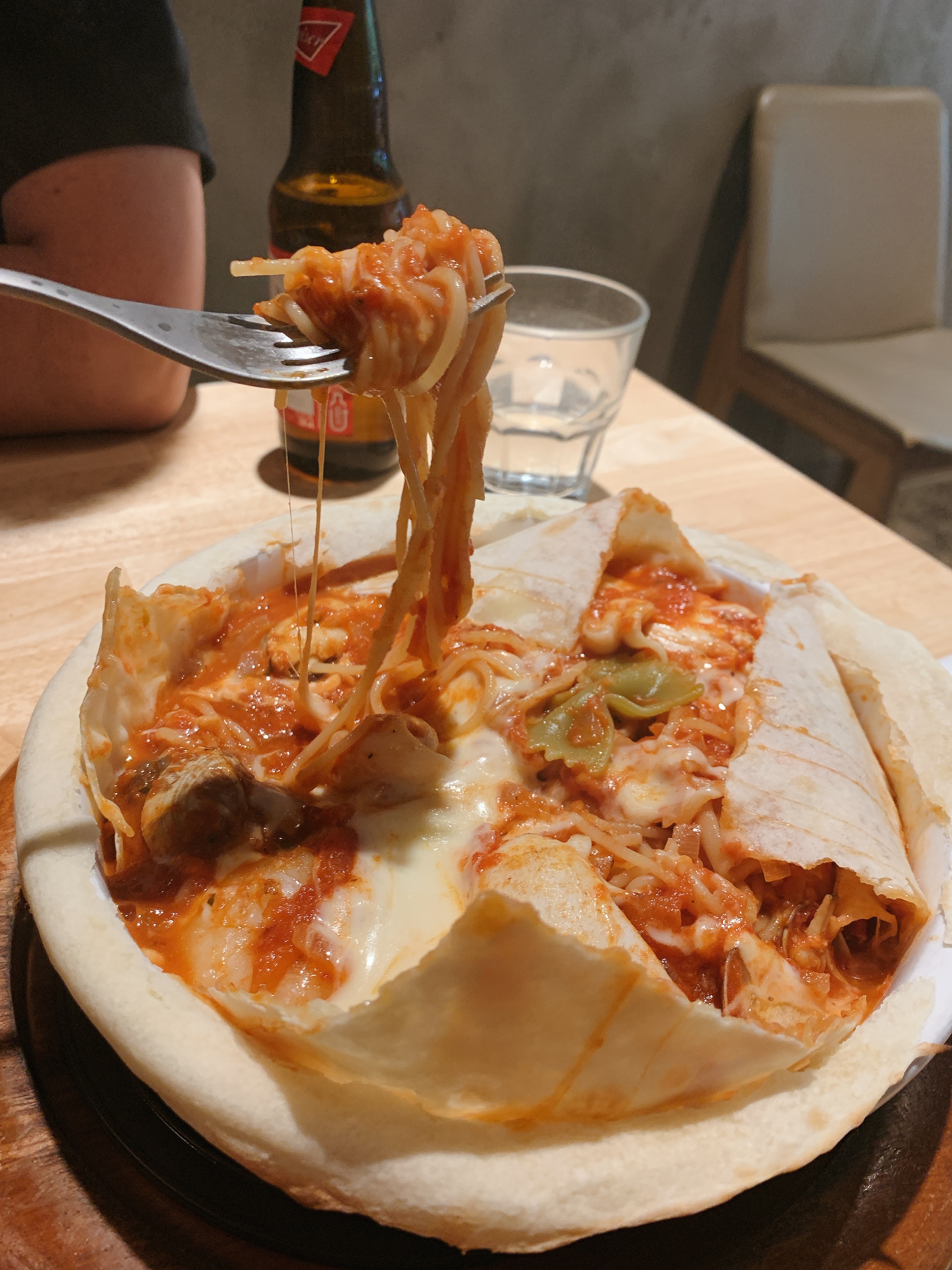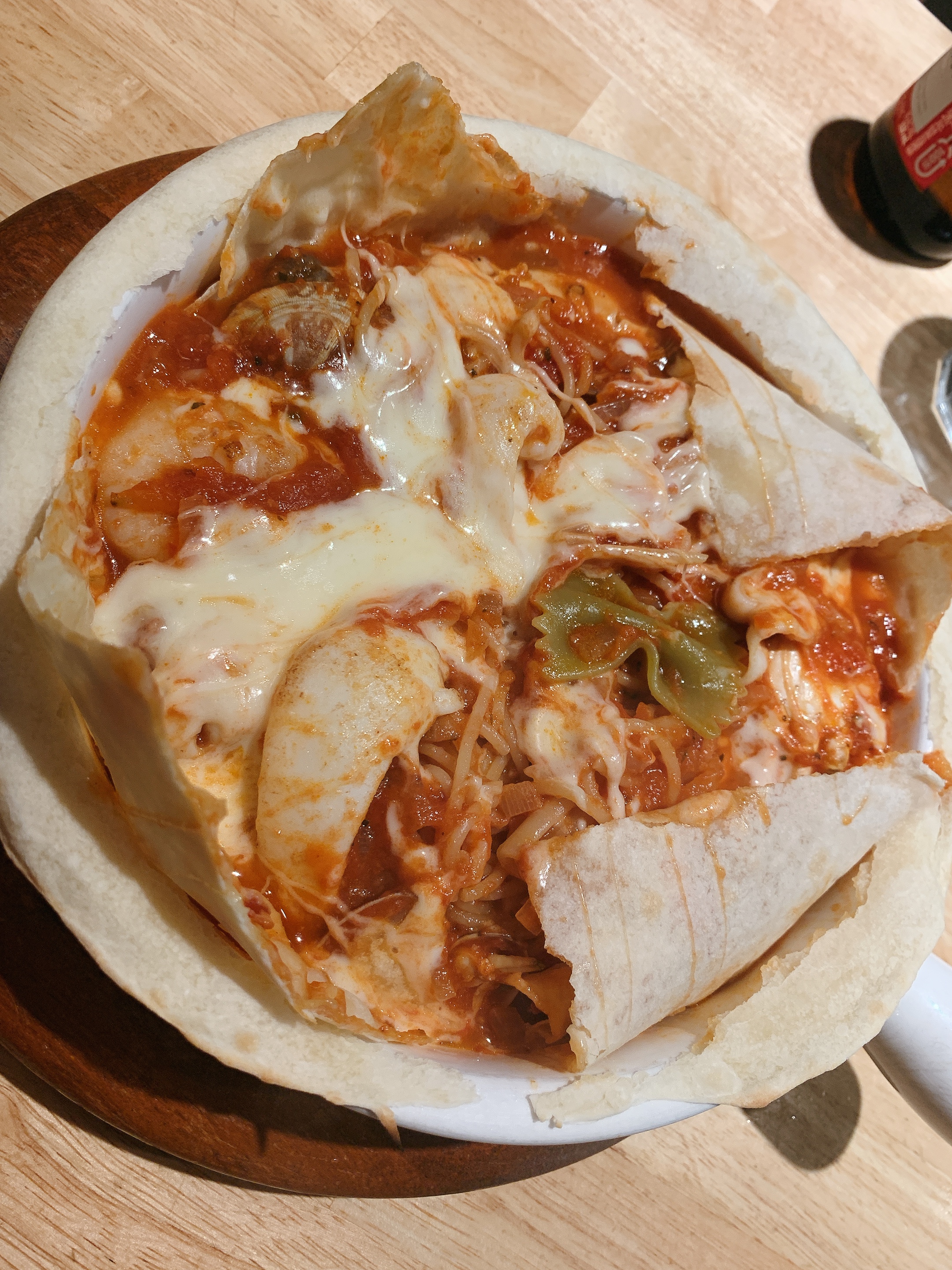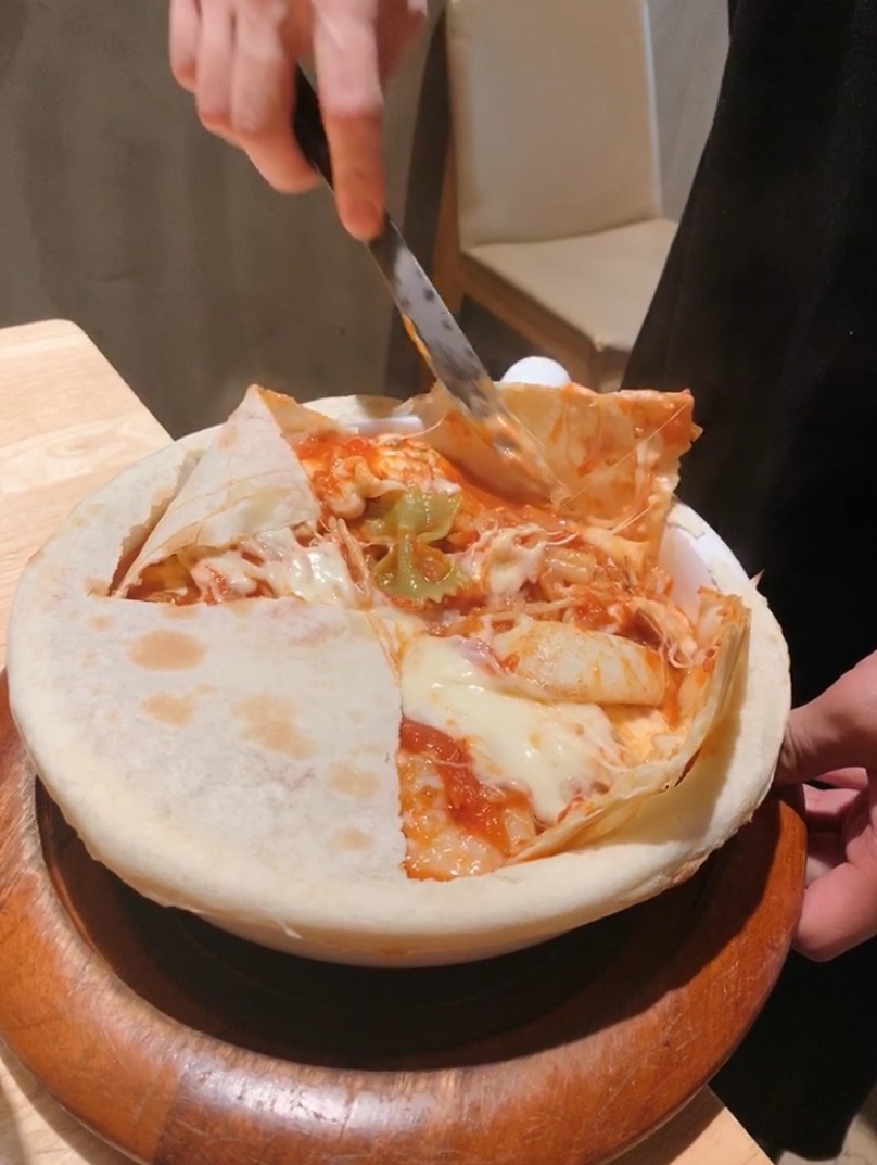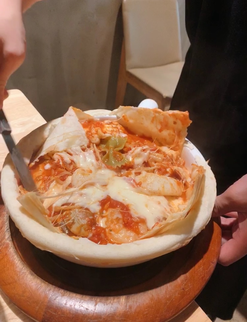 피자도우를 덮어 구워낸 파스타