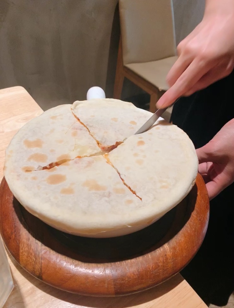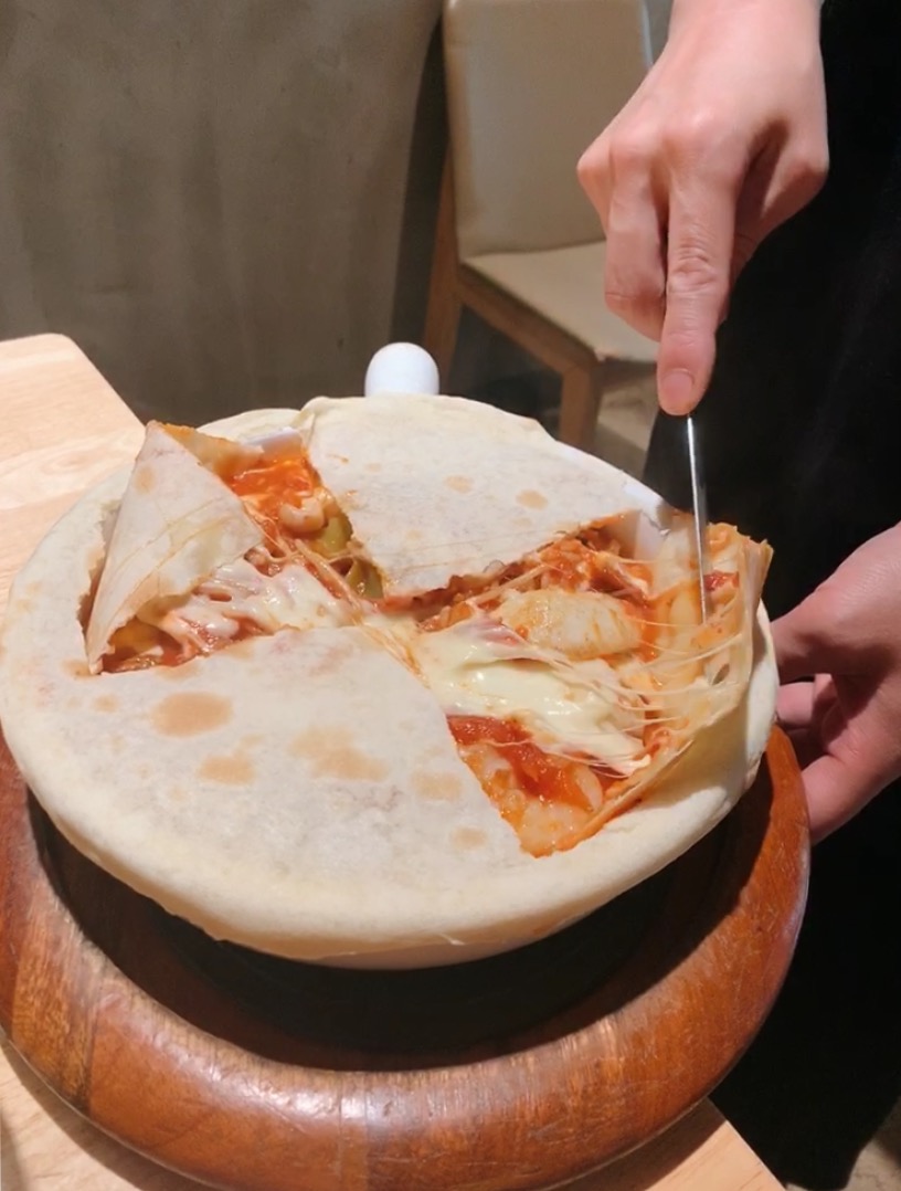 소스를 떠먹는데 치즈가 길쭉하게 늘어난다!