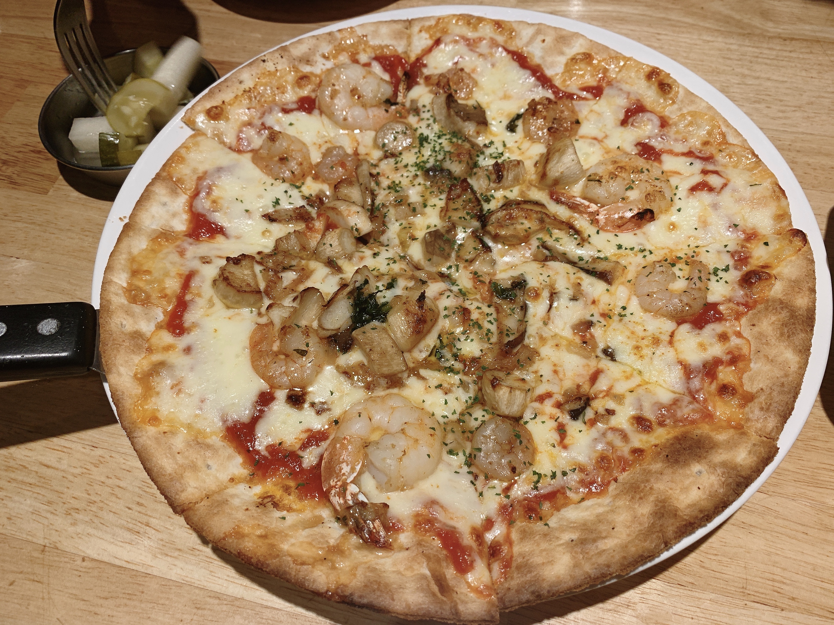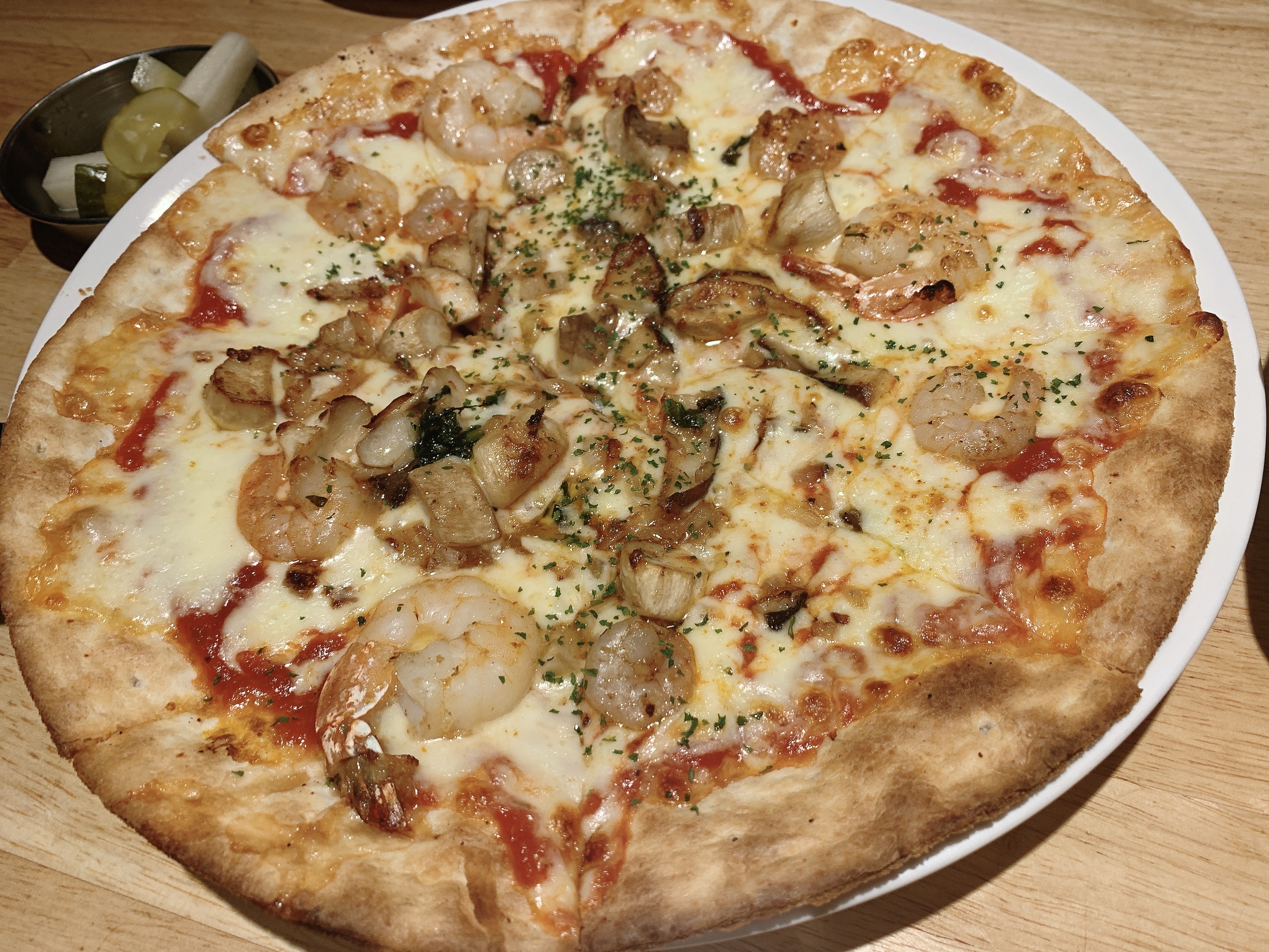 모짜렐라 치즈를 곁들인 매콤한 새우 피자
